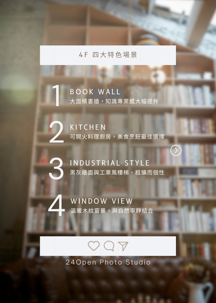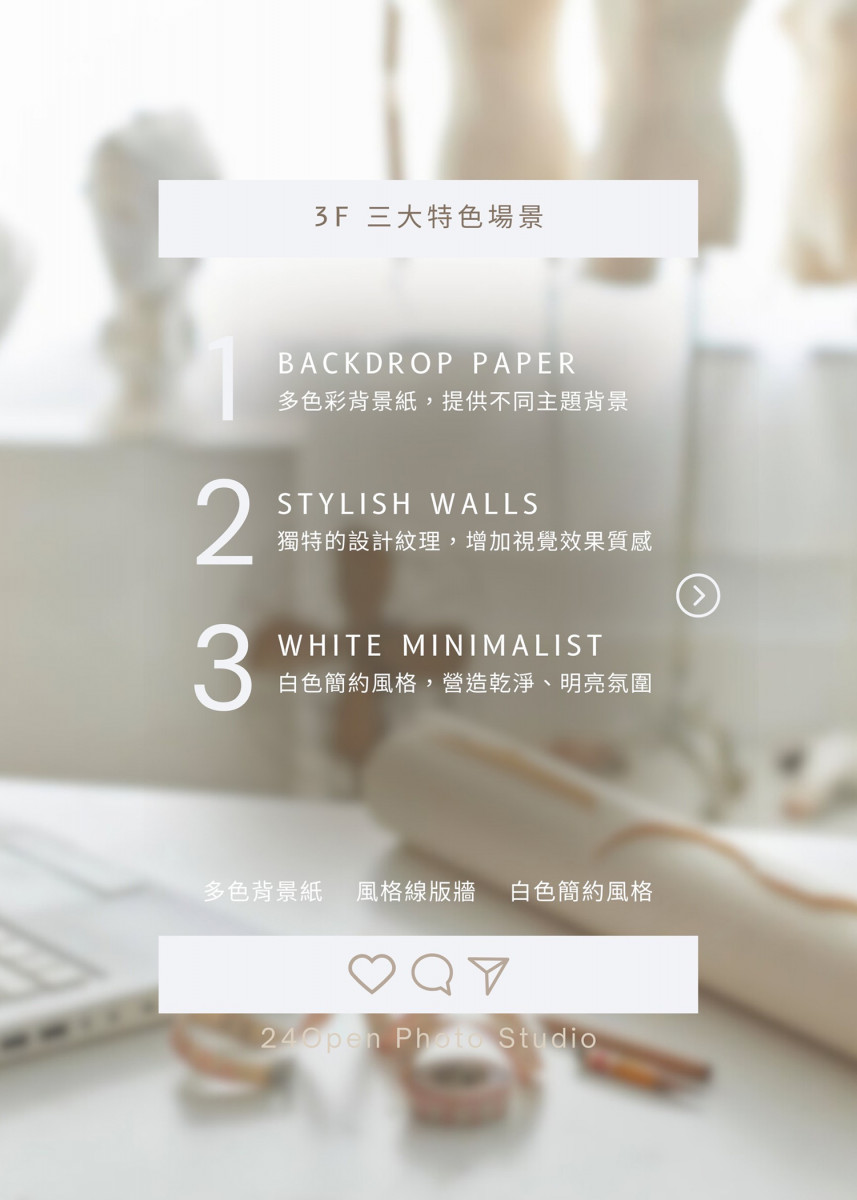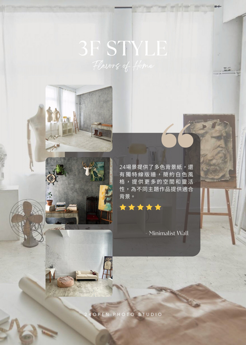 實景攝影棚 、 適合時裝拍攝 、 小型白棚素棚 、 適合烹飪拍攝 、 適合婚紗攝影