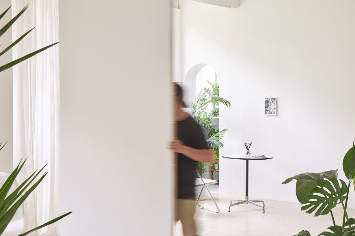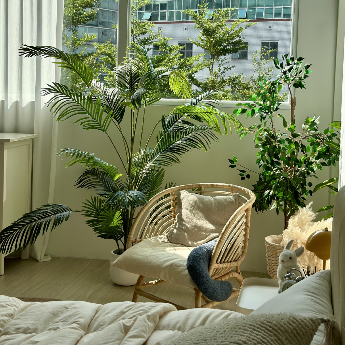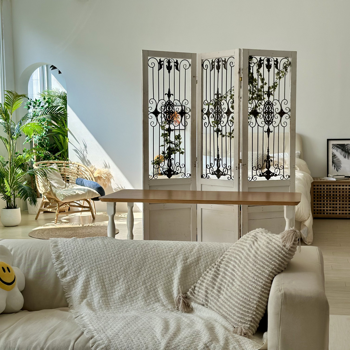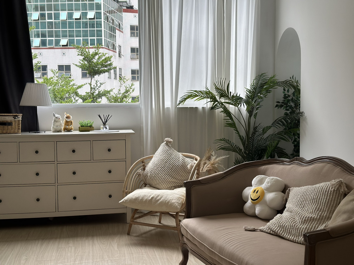 自然光 、 床景 、 綠色植物 、 家景.客廳 、 單色.撞色 、 拱門