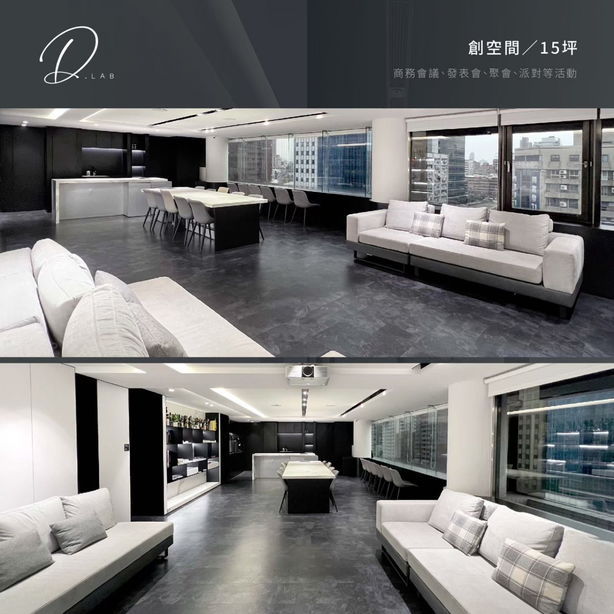 白棚 + 實景一次滿足、60坪 大空間、免費提供 4台車位、落地窗自然光、四座大型貨梯、獨立梳化間。