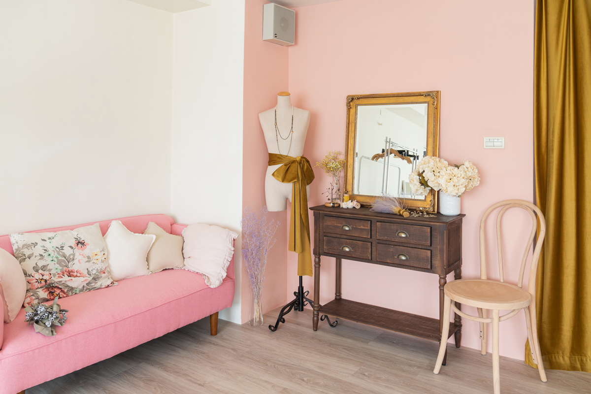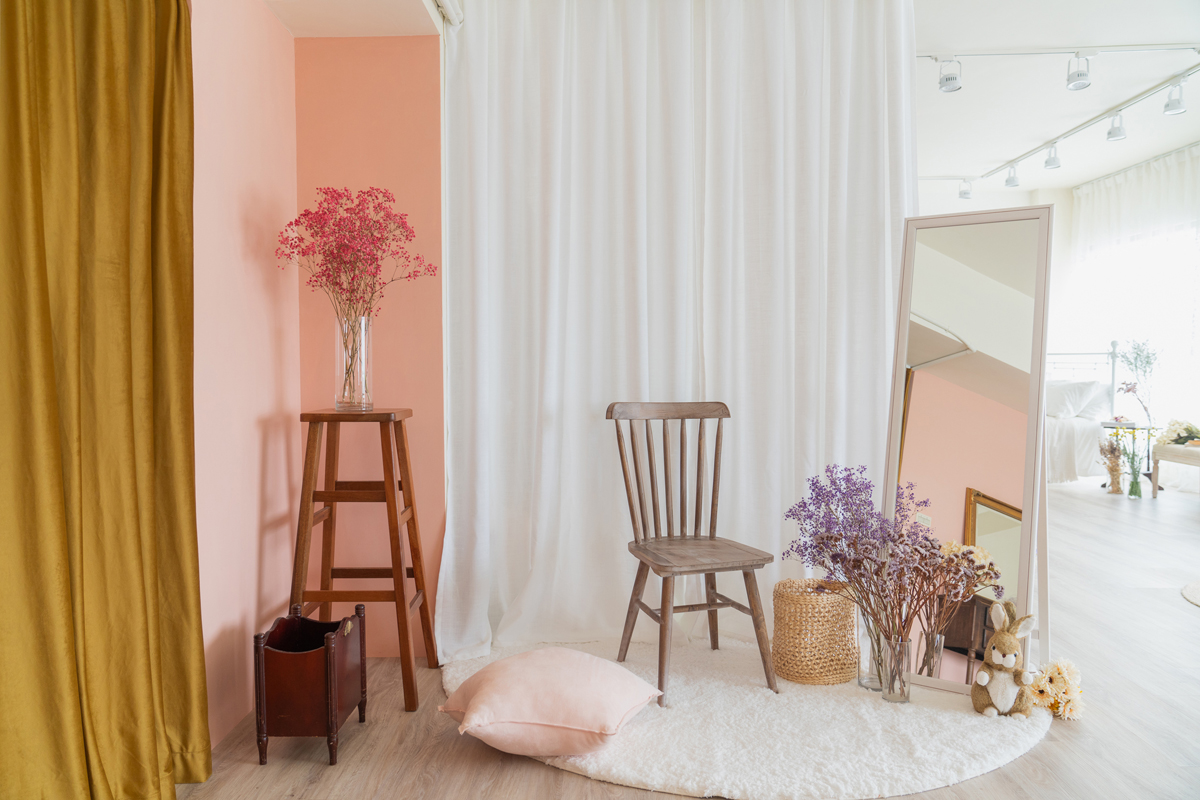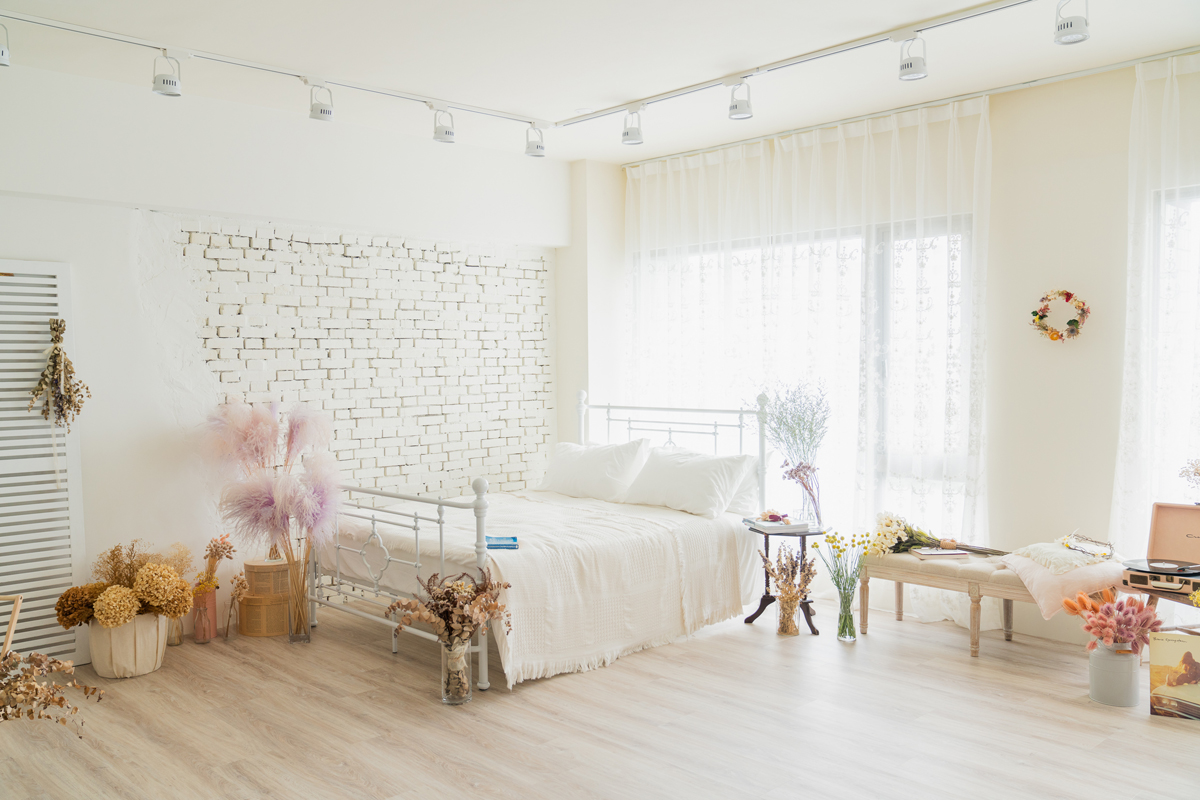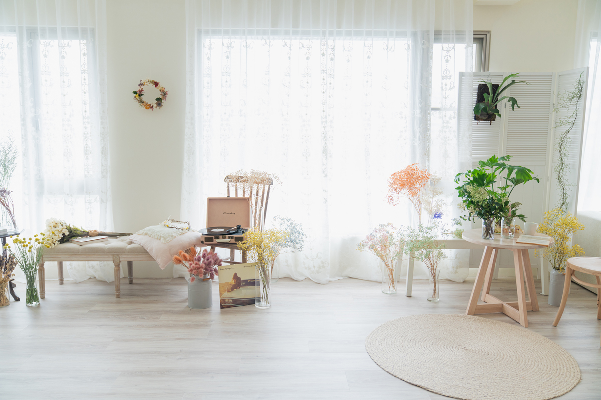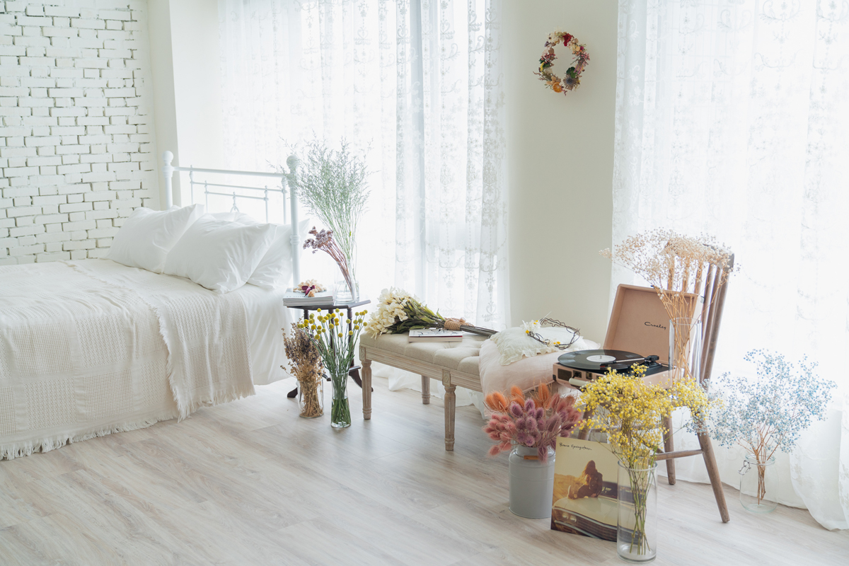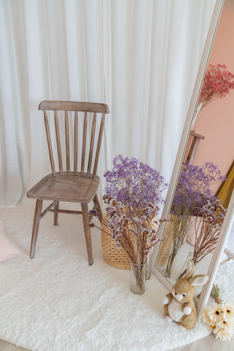 自然光 、 乾燥花 、 家景.客廳 、 綠色植物 、 落地鏡 、 單色.撞色 、 梳化間 、 床景